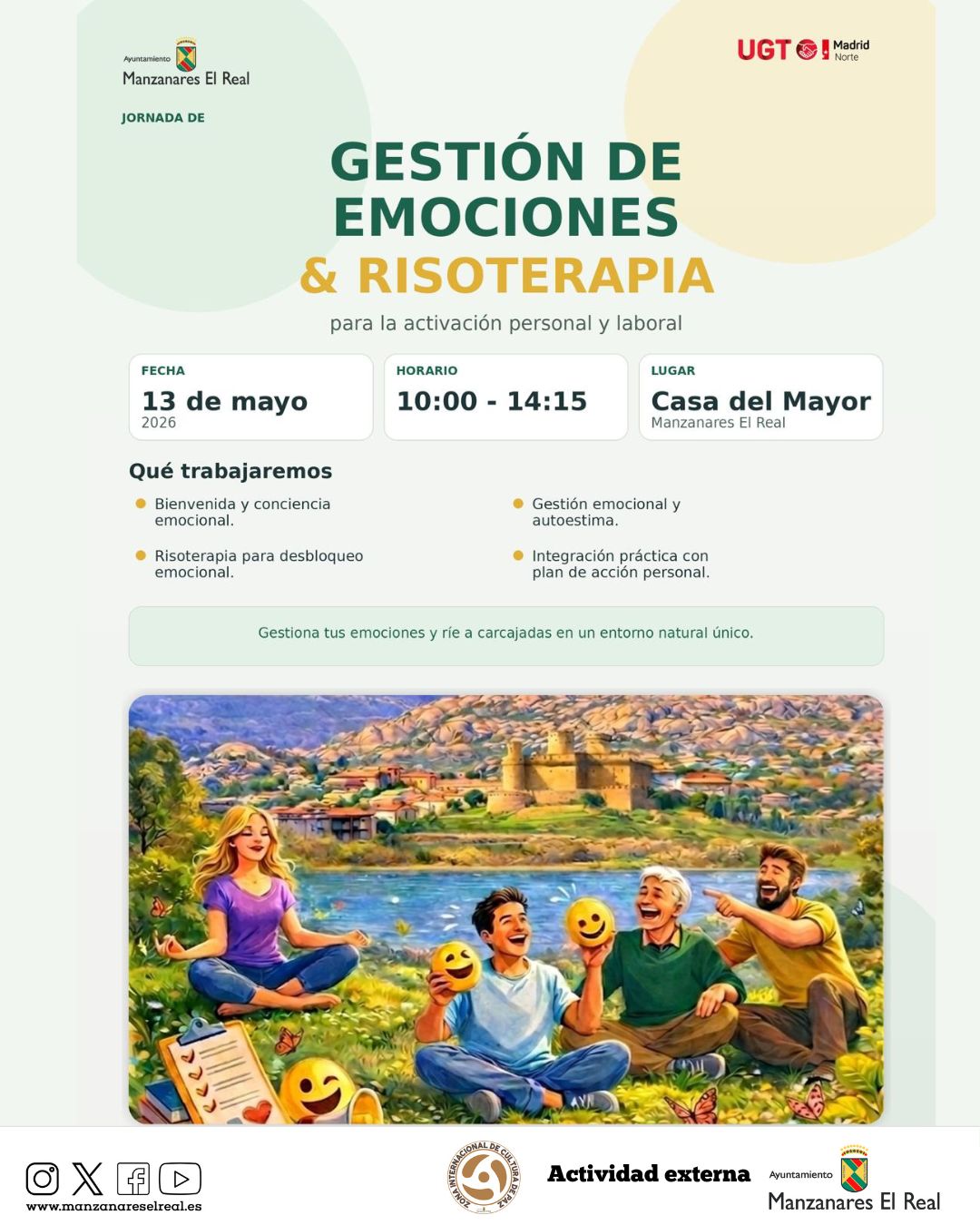 El próximo 13 de mayo de 2026, la Casa del Mayor de Manzanares El Real acogerá la Jornada de Gestión de Emociones y Risoterapia, una propuesta orientada a mejorar el bienestar personal y potenciar la motivación en el ámbito laboral.