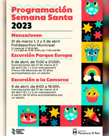 El área de Infancia y Juventud ya tiene preparadas las actividades que se desarrollarán durante los días festivos de Semana Santa. El calendario incluye el tradicional «ManzaJoven» que se celebrará en el Pabellón Polideportivo municipal; también habrá excursiones a Parque Europa (Torrejón de Ardoz) y a La Camorza.