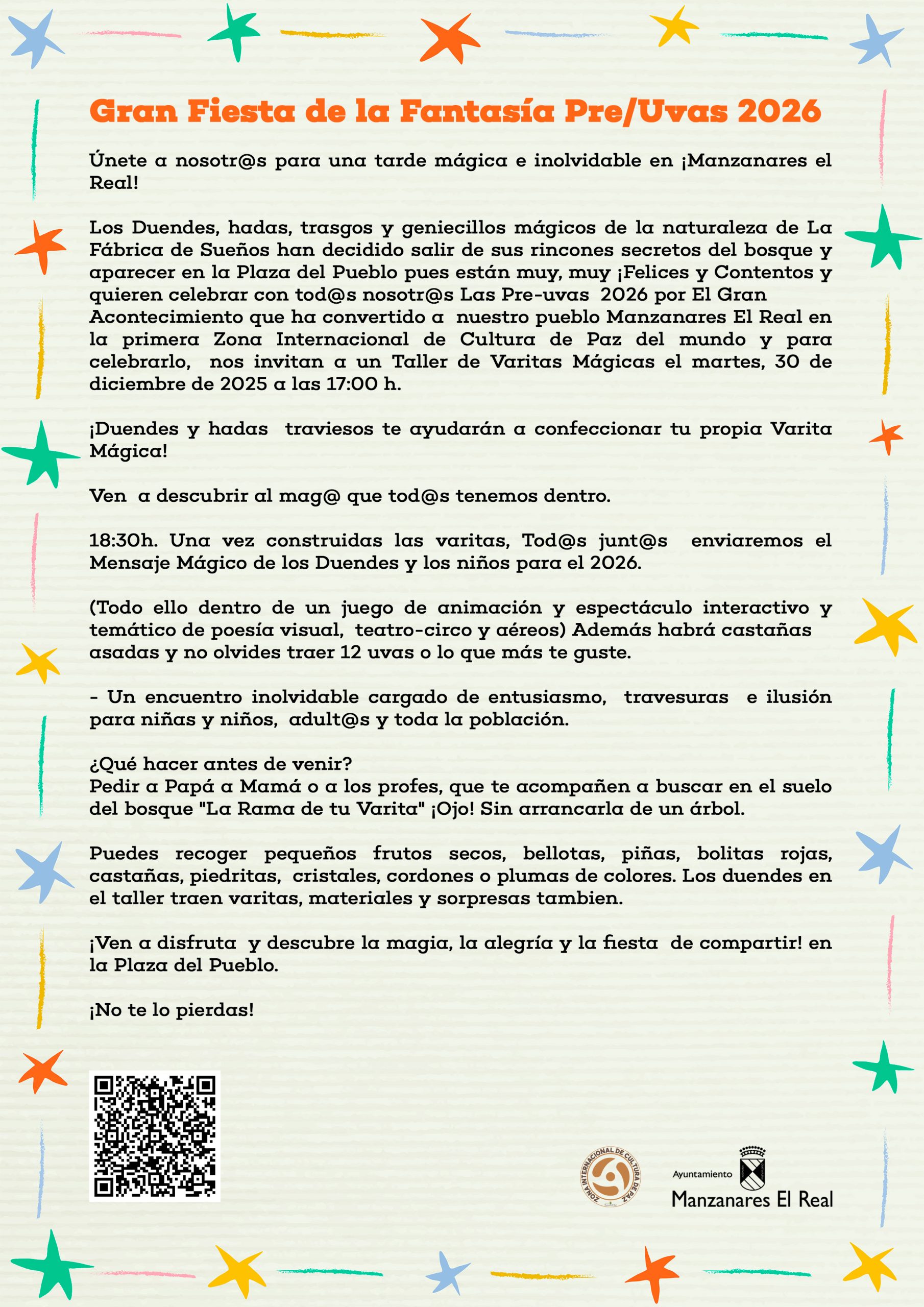 Este año, los duendes, hadas y seres mágicos de la Fábrica de Sueños, han decidido abandonar sus escondites secretos en el bosque para celebrar con todas las vecinas y vecinos un acontecimiento especial, las pre-uvas en Manzanares el Real, municipio que se se ha convertido en la primera Zona Internacional de Cultura de Paz en el mundo.