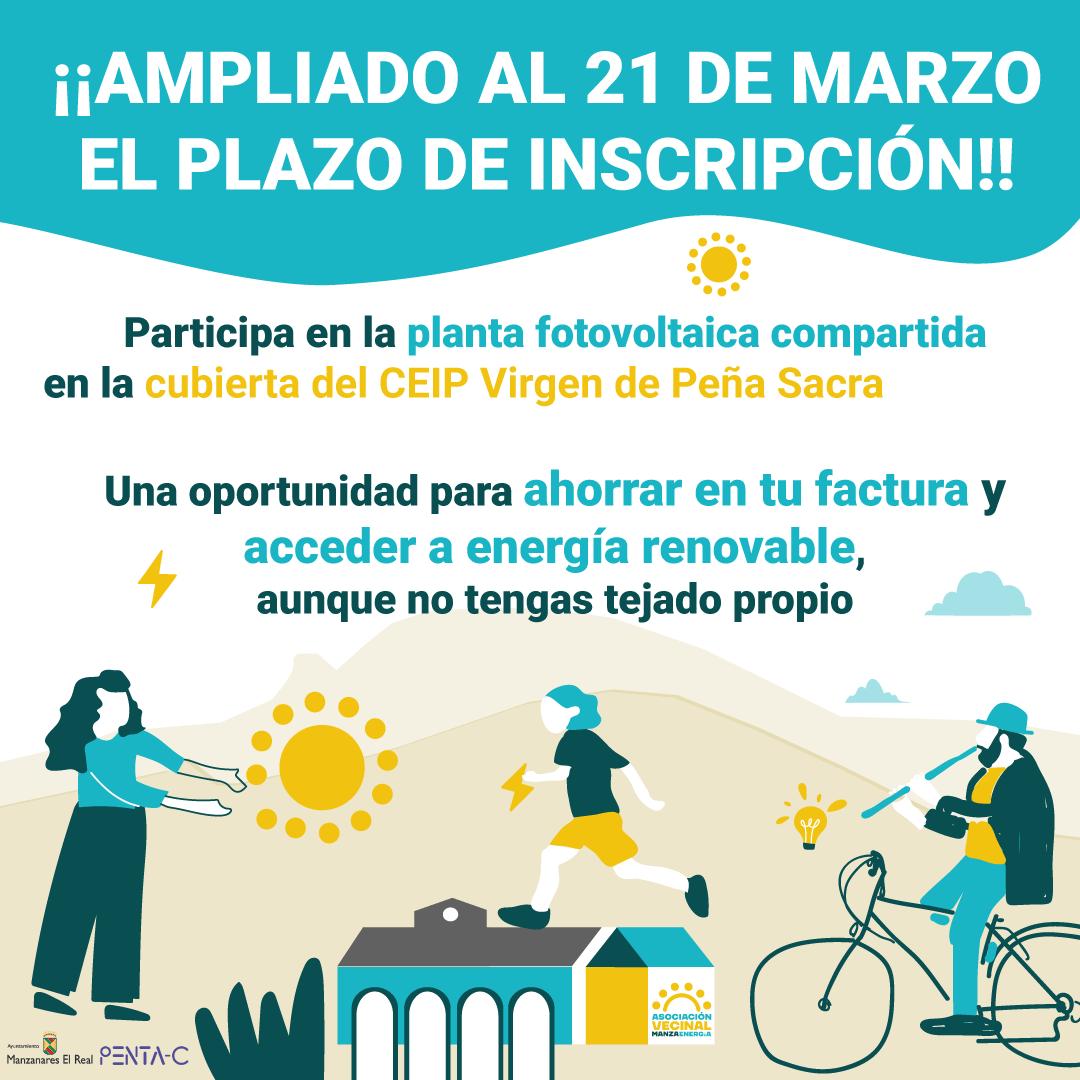 En esta línea, la Asociación Vecinal de ManzaEnergía ha ampliado hasta el 21 de marzo el plazo de inscripción para participar en su planta fotovoltaica compartida que se instalará en la cubierta del Colegio Virgen de Peña Sacra, gracias a la cesión del Ayuntamiento de Manzanares El Real. Este proyecto contará con: