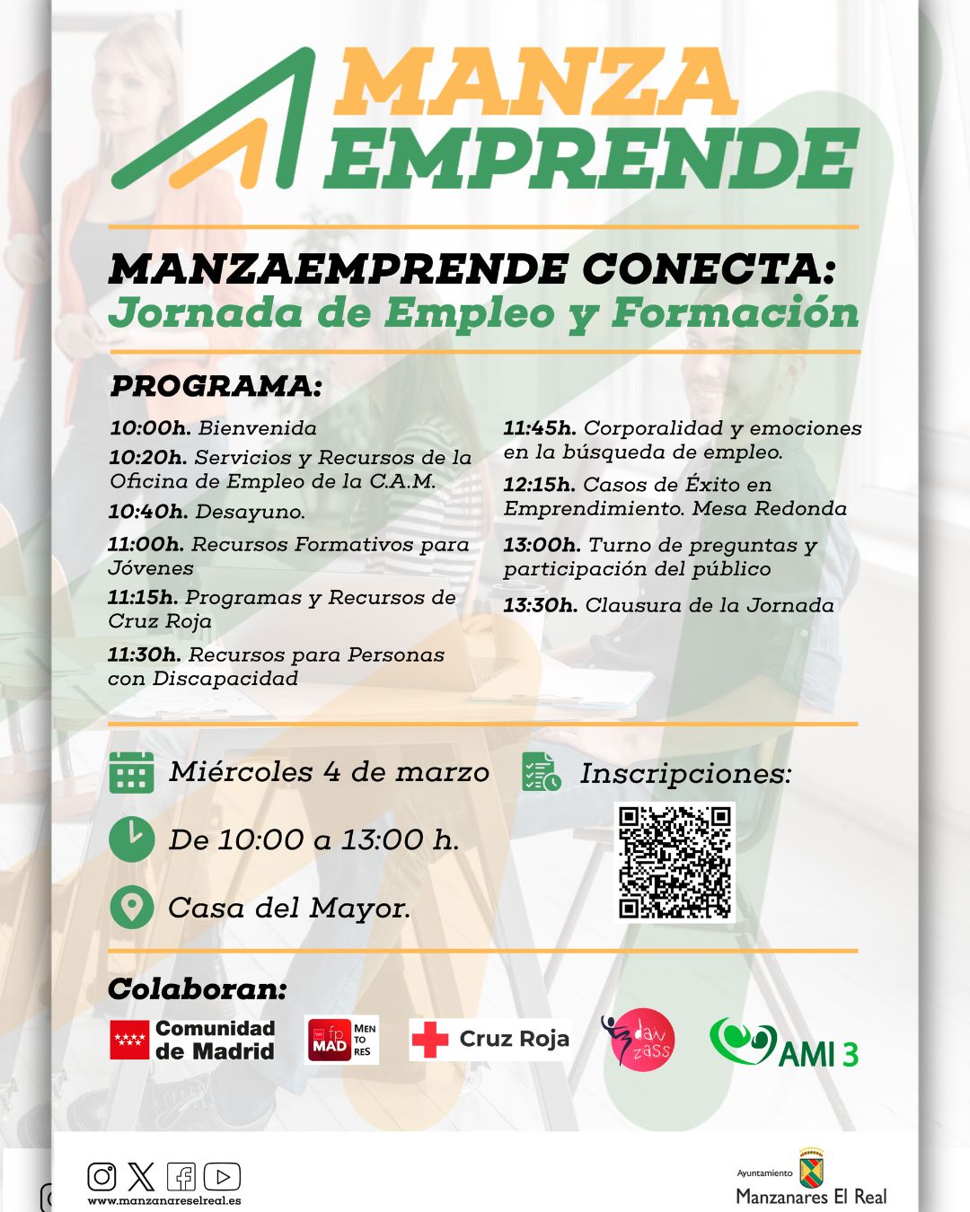Durante la jornada se presentarán los servicios y recursos de la Oficina de Empleo de la Comunidad de Madrid, así como distintas iniciativas formativas dirigidas a jóvenes. También se darán a conocer los programas y recursos de Cruz Roja, junto a una ponencia centrada en la empleabilidad e inclusión laboral de personas con discapacidad.