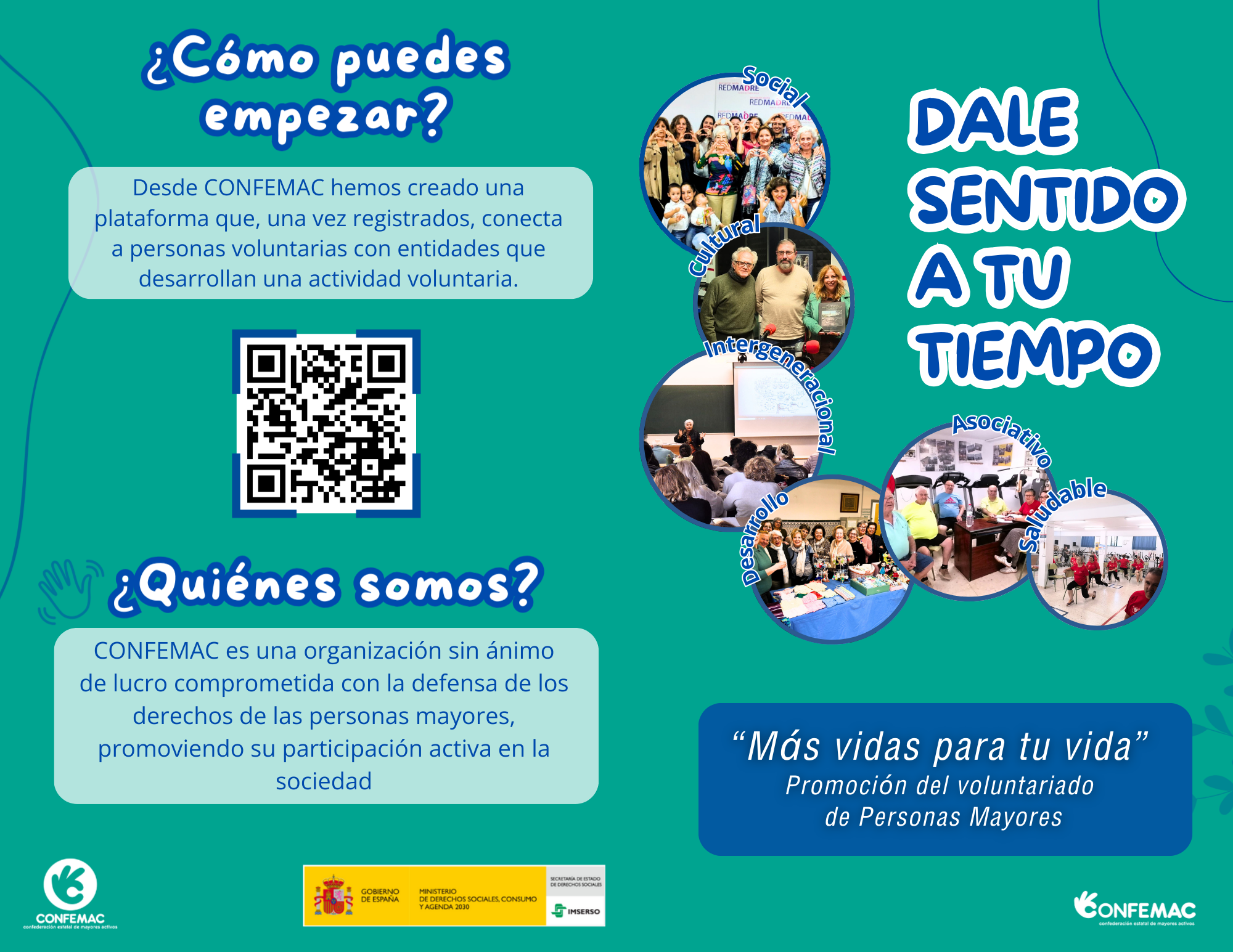 Bajo el eslogan “Dale sentido a tu tiempo” se explica cómo el voluntariado permite a las personas mayores implicarse en actividades sociales, culturales, intergeneracionales, asociativas, saludables y de desarrollo.