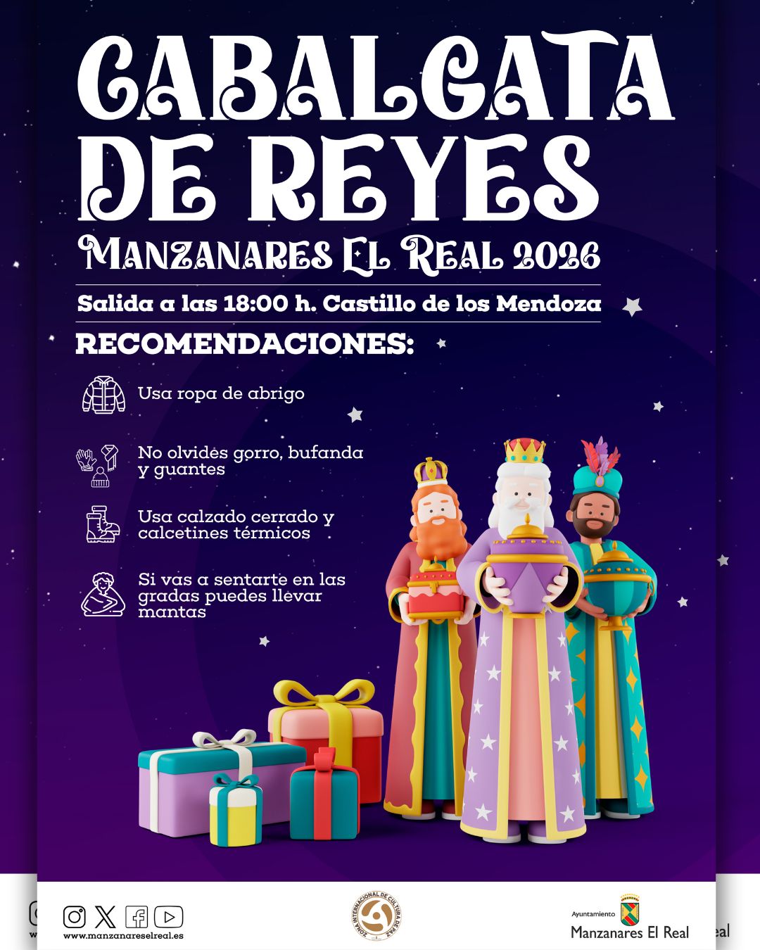 Sus Majestades los Reyes Magos de Oriente saldrán desde el Castillo de los Mendoza a las 18:00 horas y recorrerán las calles de nuestro municipio hasta llegar a la Plaza del Pueblo